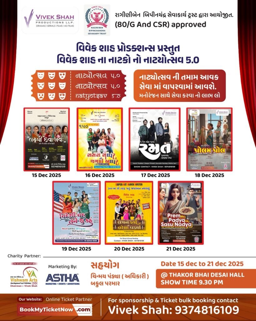 Mark your calendars for Dec 15-21 2025, as Vivek Shah Productions presents the most awaited theatrical celebration — Natyotsav! Prepare to be swept away by a week-long spectacle of cultural brilliance, where drama, artistry, and storytelling merge to create an unforgettable experience. Hosted at the iconic Thakorbhai Desai Hall, this grand festival will ignite your senses with mesmerizing performances and awe-inspiring talent. About 5,000 people will witness this Mega Event in 7 Days. Join us at Natyotsav, where the stage becomes a canvas, creativity takes center stage, and every moment is a masterpiece!